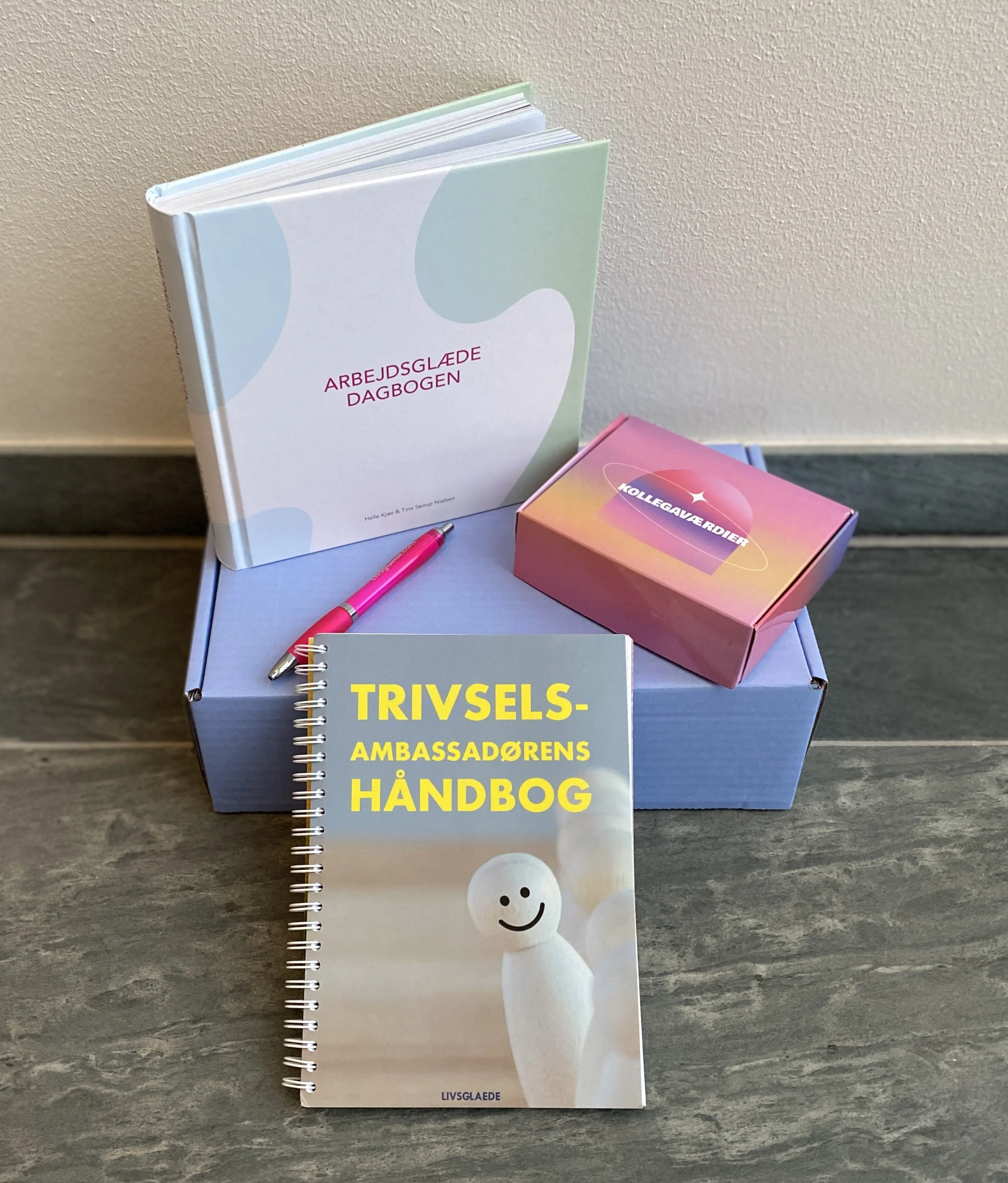 Arbejdsglæde-kit med diverse redskaber til trivselsøvelser med bl.a. kollegaværdi-samtale kort etc.
